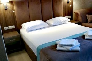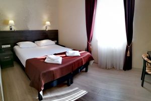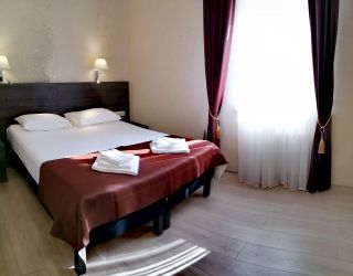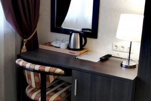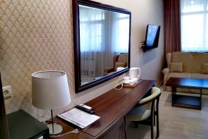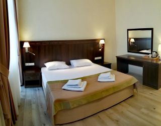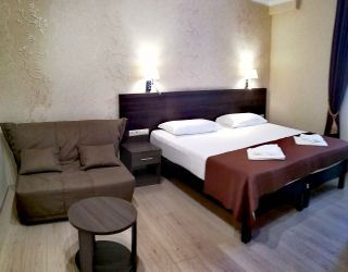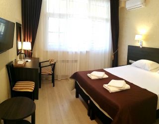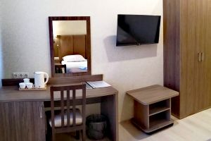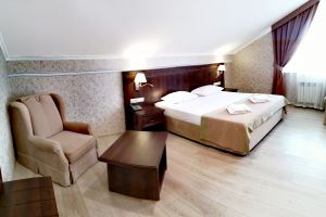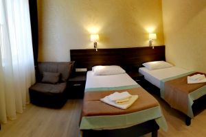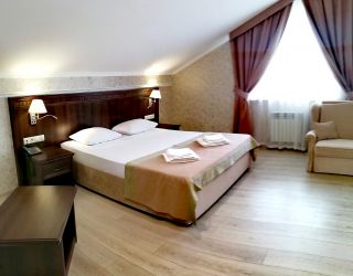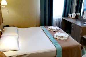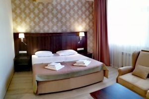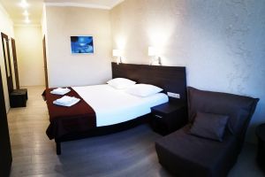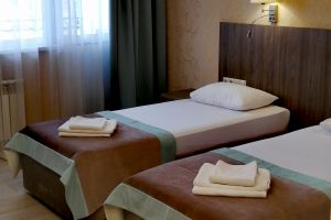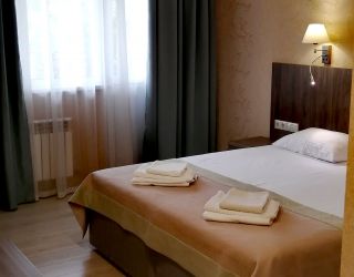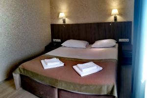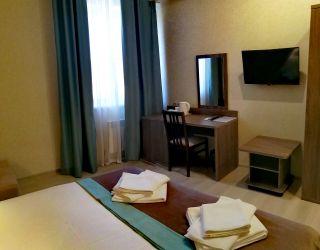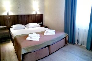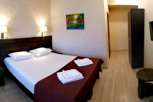 • Двухместный номер с одной большой кроватью или двумя односпальными кроватями. В номере есть всё необходимое для комфортного проживания одного или двух гостей: прихожая, шкаф, стол, стул, прикроватные тумбочки, журнальный столик, зеркало, телевизор.