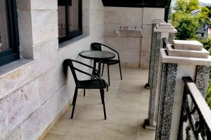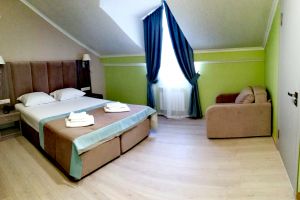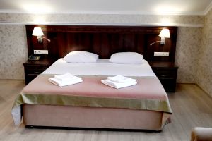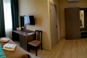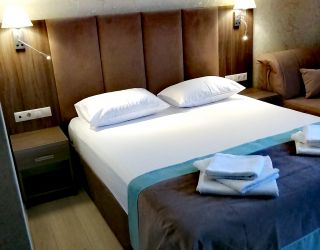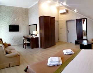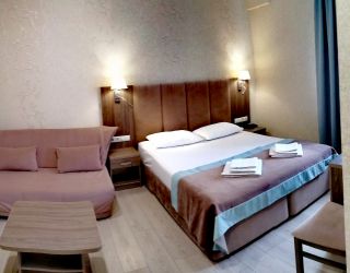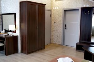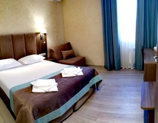 • Двухместный номер с одной большой кроватью или двумя односпальными кроватями и односпальным раскладным диваном, прихожая, шкаф, стол, стул, прикроватные тумбочки, журнальный столик, зеркало, телевизор, мини-холодильник, кондиционер, сушилка для белья.