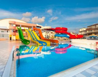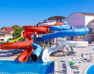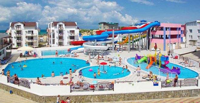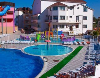 Отель семейного типа, закрытая территория, что очень удобно с детьми. На территории бассейн, аквапарк, вечером анимация для детей. В столовой Питание по типу домашней еды, мясо и молочный продукты собственного производства с фермы, томаты и огурцы тоже из теплиц. Пляж прямо у территории гостиницы