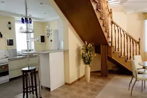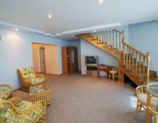 На первом этаже коттеджа расположен холл, две спальни с 2-х спальной и двумя 1,5-спальными кроватями, санузел, душ. В каждом коттедже имеется большая кухня со всем необходимым инвентарем для приготовления и подачи еды.