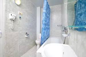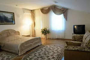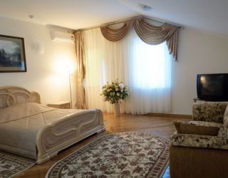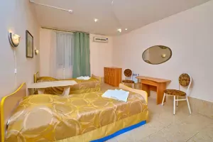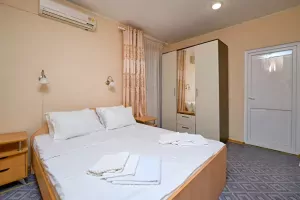 Мы были в номере Полулюкс, просторный двух комнатный с двумя санузлами, чисто, уютно, выход во двор к фонтану. Слышимости в номере соседей или улицы нет, тихо. Большая территория, есть где прогуляться или побегать ребенку. На территории кулеры с водой, бесплатная стоянка для авто. В 5 минутах ходьбы от моря, очень удобно, пляж чистый, песок, море с комфортным входом, на пляже нет навящевой рекламы, в меру-банан и тд, не напрягало. Включена еда, не всегда всего хватало, приносят, иногда приходилось ждать или просить принести чашки, например. За такую небольшую цену в этом не видели проблем, еда довольно однообразная, несколько раз ужинали в других кафе доя разнообразия, либо в Анапе, куда выезжали вечером погулять, тк там можно более активно провести вечернее время на каруселях или в парке. На территории есть крытый бассейн, боулинг, бар, детская комната, но мы не ходили. Я бы повторно сюда приехала, хорошее соотношение цена-качество.