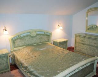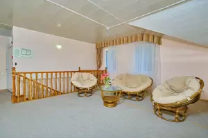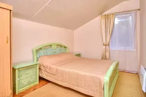 На втором этаже — холл с большим балконом, одна спальня с двумя односпальными кроватями, сан узел.