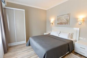 Номера №301, 307, 313, 315. S=74-86 кв.м, 2 спальни (2-сп. и 1,5-сп.кровати или две 2-сп.кр), прикров.тумбочки, мягкая мебель, журн.столик, шкаф, столовая зона (не везде) ТВ, Х, два с/у (душ, биде, сауна или турец.баня)