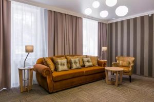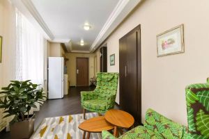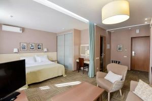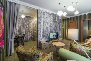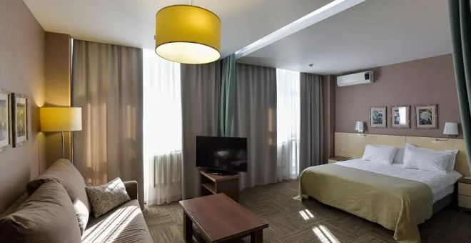 Просторный двухкомнатный номер с кухонной зоной 46-49 кв.м., состоящий из спальни, просторной гостиной и кухонной зоны. Классический дизайн интерьера, атмосфера гармонии и уюта — здесь все способствует беззаботному отдыху. В номере возможно комфортное размещение одного-двух гостей или семьи с детьми. Дополнительное размещение предлагается на раскладывающемся диване. Есть балкон с кофейным столиком и стульями.