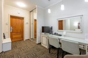 Просторный однокомнатный номер-студия площадью 36-39 квадратных метра, состоящий из трех зон: прихожая, гостиная и спальная зона. Оформлен в современном стиле, оборудован качественной и удобной мебелью, современной европейской сантехникой.