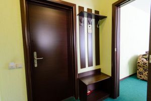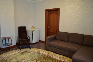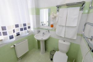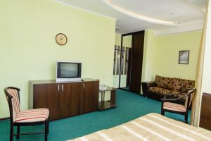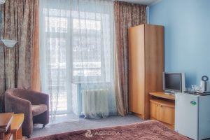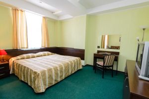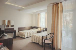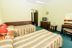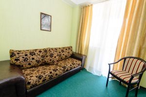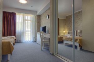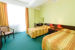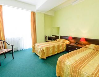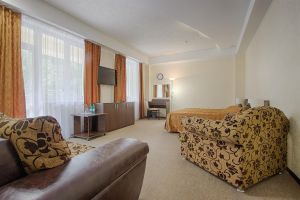 Площадь 28 кв.м (комната, коридор, санузел). В номере 2 основных места и 1 дополнительное (раскладной диван).Оснащение номера: 2 кровати-трансформеры (по просьбе гостя сдвигаются), диван-софа, шкаф-купе, плечики, туалетный столик с зеркалом, журнальный столик, полукресло, стул, 2 прикроватные тумбочки, торшер, 2 настольные лампы, телевизор, холодильник, фен, электро-чайник, сейф, комплект полотенец, телефон. Ковровое покрытие. Балкон.