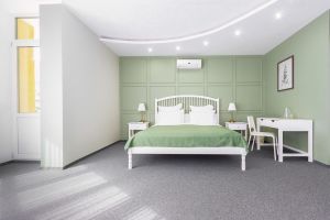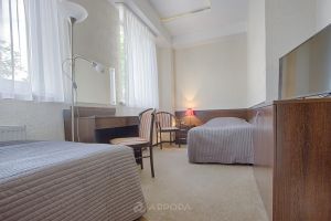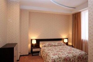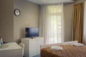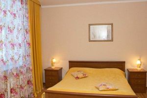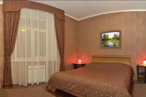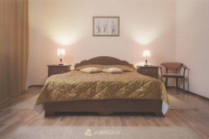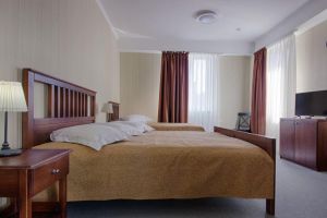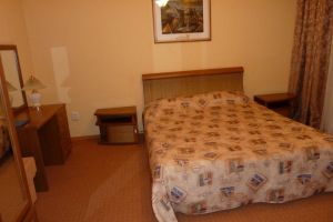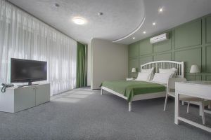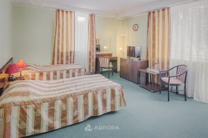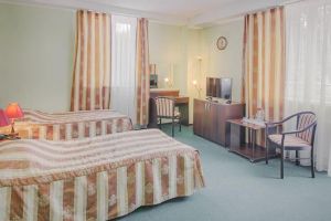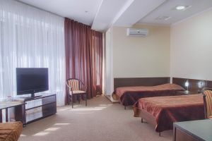 Оснащение номера: 2 кровати( по просьбе гостя сдвигаются), в некоторых номерах двухспальные кровати ,шкаф для одежды, тумба прикроватная, комод, зеркало, стул-ракушка, телевизор, холодильник, набор посуды, фен, кондиционер, чайник, халаты, комплект полотенец, в отдельных номерах туалетный столик с зеркалом или шкаф-стенка.