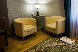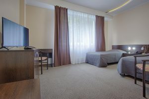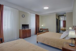 Оснащение номера: 2 кровати-трансформеры (по просьбе гостя сдвигаются), шкаф-купе, плечики, туалетный столик с зеркалом, холодильник, телевизор, журнальный столик, полукресло, стул, 2 прикроватные тумбочки, торшер, 2 настольные лампы, фен, сейф, электро-чайник, комплект полотенец, телефон. Ковровое покрытие в номере.
