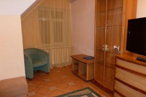 Оснащение номера: 2 кровати-трансформеры (по просьбе гостя сдвигаются), диван- софа, шкаф-купе, плечики, туалетный столик с зеркалом, тумба под телевизор, 1 стул, 2 прикроватные тумбочки, 2 настольные лампы, телевизор, холодильник, фен, эл.чайник, сейф, халаты, комплект полотенец, телефон. Ковровое покрытие. Балкон.