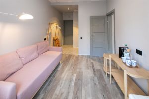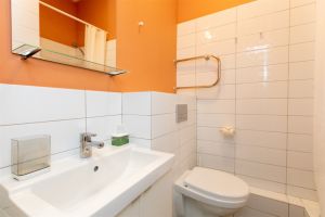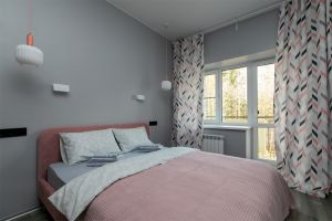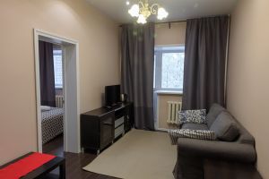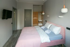 Двухкомнатный номер для комфортного размещения 2 человек. В гостиной расположен раскладной диван, в спальной комнате двуспальная кровать.Легкая стилизация под 70-е годы, инспирированная шикарной плиткой в ванных комнатах, которую хотелось сохранить. Декор выбирался в ретро-стилистике. Использовались репродукции плакатов "Добро пожаловать в СССР"