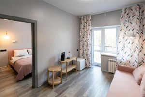 2-х комнатный люкс с 2 спальной кроватью и дополнительным местом на диване 4 этажДвухкомнатный номер для комфортного размещения 2 человек. В гостиной расположен раскладной диван, в спальной комнате двуспальная кровать.