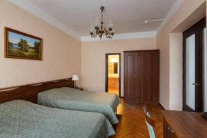 Двухкомнатный номер для двоих гостей с двумя односпальными и одной односпальной кроватью