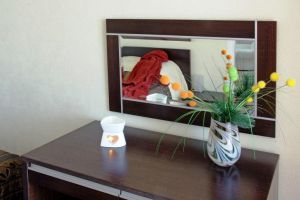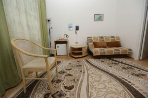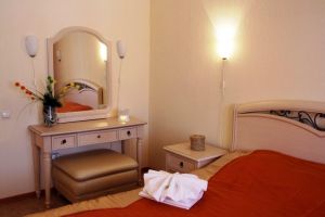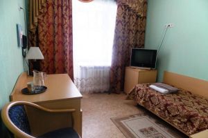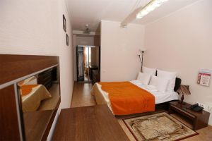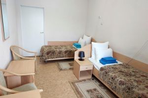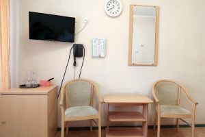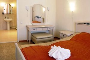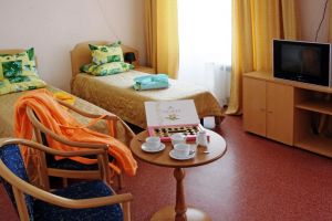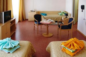 Две односпальные кровати, тумбочки, стулья,ТВ, фригобар (холодильник встроенный), телефон, набор посуды, шкаф для одежды. WS, раковина, душевая кабина. В стоимость входит четырехразовое питание, лечебные процедуры, досуговые мероприятия.