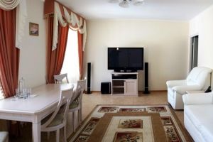 Прихожая, гардеробная (шкаф-купе, комод), гостиная (мягкая мебель, обеденная зона, домашний кинотеатр, ТВ, холодильник, телефон, набор посуды, чайник), спальня (спальный гарнитур, двуспальная кровать). Два санузла (душевая кабина с гидромассажем, раковина, WC, биде, фен). 2 осн. места + 2 доп. места (диван, раскладушка). В стоимость входит четырехразовое питание, лечебные процедуры, досуговые мероприятия