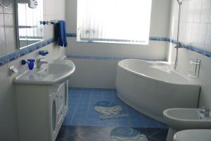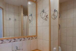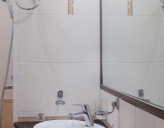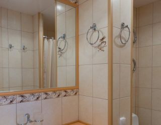 Санузел с ванной или с душем, чайник, посуда, ТВ.