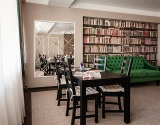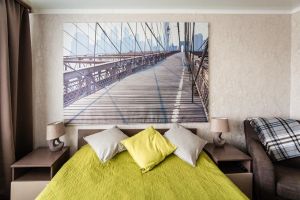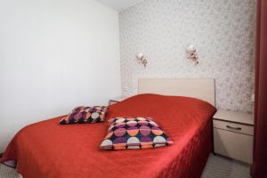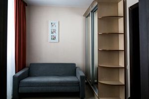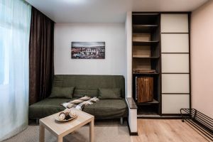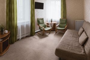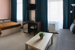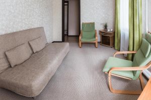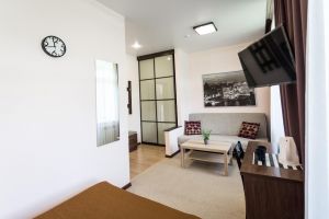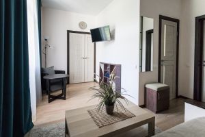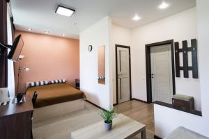 Просторный номер, состоящий из прихожей, большой ванной комнаты и жилой зоны свободной планировки с неизолированными друг от друга спальней и гостиной, и полным перечнем необходимой мебели для комфортного отдыха.