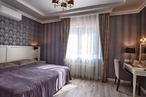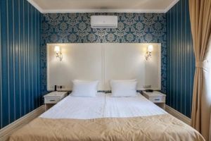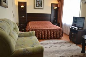 В номере: одна двуспальная кровать (160 х 200 нераздвижная, есть вариант 180 х 200 - раздвижная),диван, телевизор, телефон, сейф, холодильник, сплитсистема, шкаф, стол и стулья, электрочайник, туалетная комната, фен.