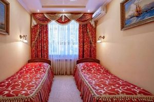 В номере: 2 кровати (90 х 200), ЖК-телевизор, холодильник, сплитсистема, шкаф, две тумбы прикроватные, лоджия,туалетная комната, фен, телефон, электрочайник, набор посуды, стол туалетный с зеркалом, вешалка настенная с зеркалом, чемоданница.