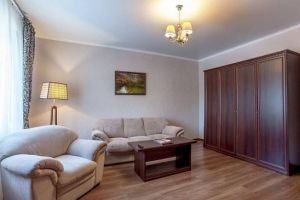 В одной комнате: двуспальная кровать (180 х 200), шкаф, 2 тумбы, телевизор, сплитсистема; 2 комната - гостиная с мягкой мебелью. Раздельный сан. узел. В кухне - обеденная группа, холодильник, электрочайник, микроволновая печь.