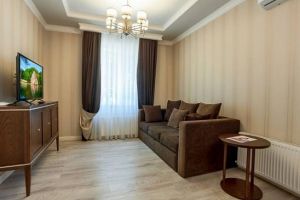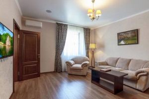 Просторный и уютный номер категории «Люкс». Оборудован удобной мебелью, современной техникой и всем необходимым для полноценного отдыха. К услугам гостей гостиная, спальня и ванная комната. В номере: 2 кровати (90 х 200), ЖК-телевизор, холодильник, сплитсистема, шкаф, мягкая мебель (диван + два кресла), лоджия,туалетная комната, телефон, электрочайник, набор посуды, стол туалетный с зеркалом, 2 кресла + пуф, комод.