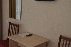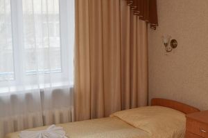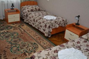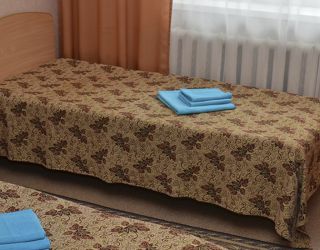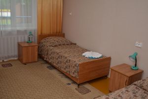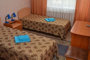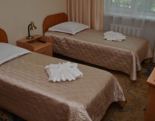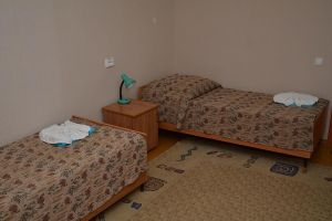 Однокомнатный номер, две односпальные кровати, холодильник, ЖК-телевизор, набор столовой посуды, ванная комната (ванна, унитаз, раковина). Балкон.