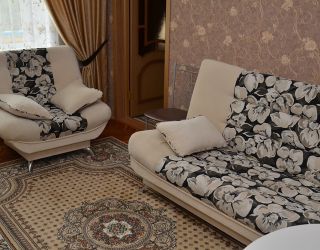 Двухкомнатный номер, двуспальная кровать, холодильник, ЖК-телевизор, телефон, журнальный столик, сплит-система,сейф, набор столовой посуды, диван, два кресла, набор мебели для прихожей, ванная комната (ванна, унитаз, раковина, биде, фен). Балкон