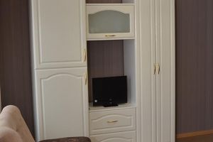 Однокомнатный номер, две односпальные кровати, холодильник, ЖК-телевизор,сейф, набор столовой посуды,шкаф-купе,ванная комната (полуванна, унитаз, раковина). Балкон