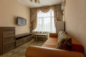 В номере: 2 комнаты (гостиная/спальня), двуспальная кровать, ТВ (эфирное цифровое телевидение), прикроватные тумбочки, диван, журнальный столик, фен, холодильник, чайник, шкаф для одежды, кондиционер, балкон с видом на р.Волгу или на территорию санатория. Ванная комната: ванна/душевая кабина, полотенца, мыло, шампунь