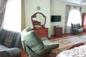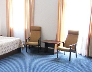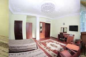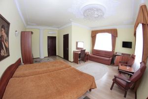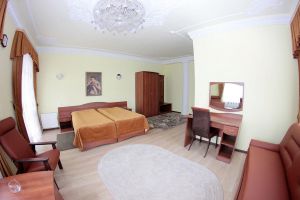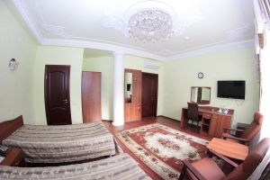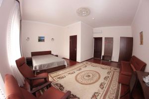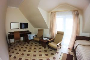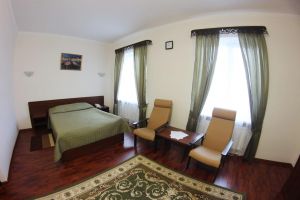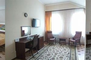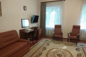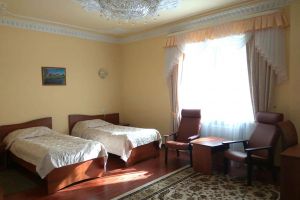 Номер с видом на лес. В номере: Мини-холодильник, ТВ, кондиционер, кресло деревянное кожаное с подлокотником (2шт), журнальный столик, туалетный столик с зеркалом, 1-спальная кровать (2шт), тумбочка прикроватная (2шт). Посуда: набор на 2 персоны - чайные пары, чайные ложки. Кувшин для сока, бокалы.