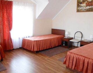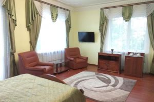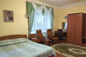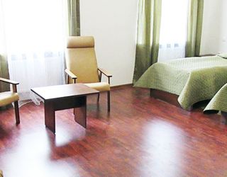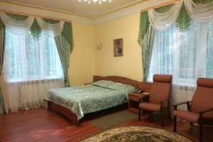 Номер с видом на лес. В номере: Мини-холодильник, ТВ, кондиционер, кресло деревянное кожаное с подлокотником (2шт), туалетный столик с зеркалом, 1-спальная кровать (2 шт), тумбочка прикроватная (2шт).