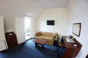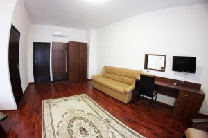 Номер с видом на лес. В номере: Мини-холодильник, ТВ, кондиционер, шкаф для одежды, диван кожаный раскладной, туалетный столик с зеркалом, 2-х спальная кровать (160*200), тумбочка прикроватная (2шт).