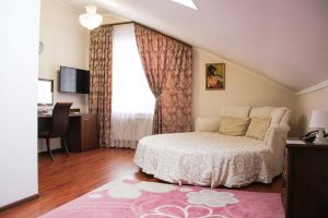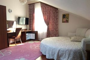Номер с видом на лес. В номере: Мини-холодильник, ТВ, кондиционер, шкаф для одежды, диван кожаный раскладной, туалетный столик с зеркалом, 2-х спальная кровать круглая (D-200), тумбочка прикроватная (2шт).