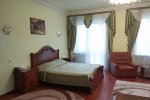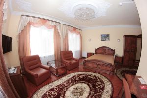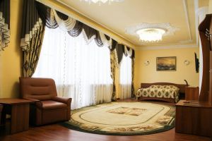 Номер угловой с видом на р.Ока. В номере: Мини-холодильник, ТВ, кондиционер, шкаф для одежды резной, журнальный столик, кресло кожаное (2шт), туалетный столик с зеркалом, 2-х спальная кровать резная (160*200), тумбочка прикроватная резная (2шт). Посуда: набор на 2 персоны - чайные пары, чайные ложки. Кувшин для сока, бокалы.