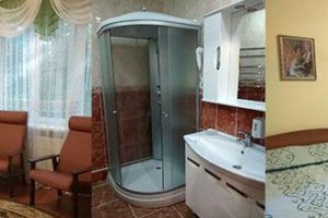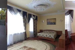 Диван кожаный угловой раскладной, журнальный столик, комод с зеркалом, 2-х спальная кровать резная (160*200), тумбочка прикроватная резная (2шт). Посуда: набор на 2 персоны - чайные пары, чайные ложки. Кувшин для сока, бокалы.Номер с видом на р.Ока