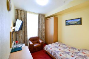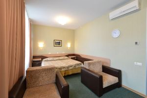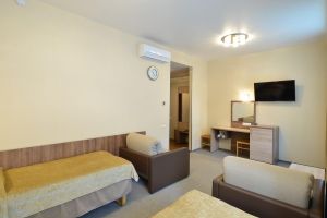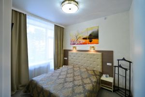 Однокомнатный номер с балконом. В номере две кровати–трансформера, которые объединены в двуспальную (180 см). Подходит для проживания двух гостей, с возможностью размещения третьего на дополнительном месте (еврораскладушка).