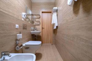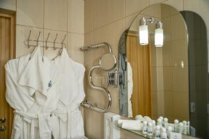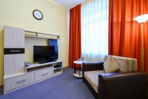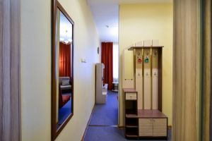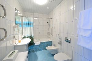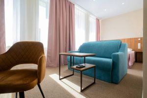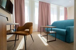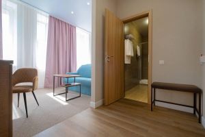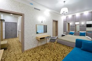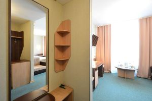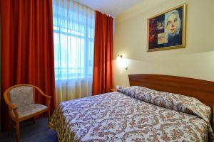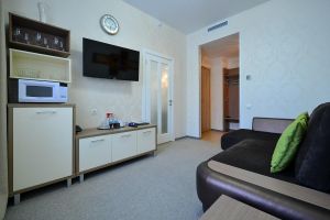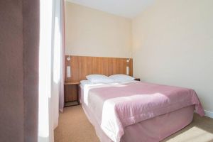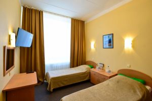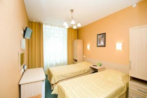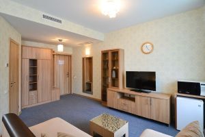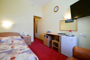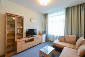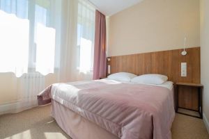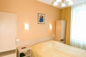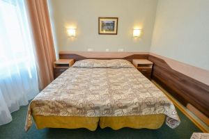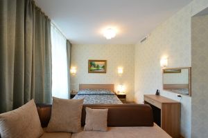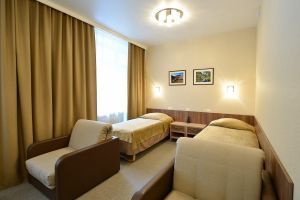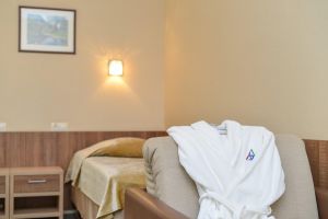 Однокомнатный номер подходит для комфортного проживания двух гостей, с возможностью размещения третьего на раскладном диване. В номере две односпальные финские кровати – трансформеры с ортопедическим матрасом, которые можно объединить в двуспальную кровать. (160 см).