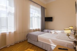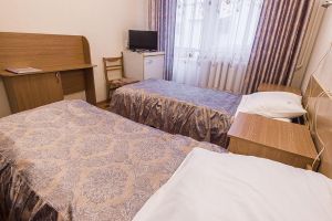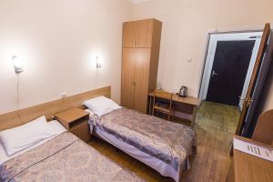Удобства: Зеркало, Раковина, Картины, Прикроватные лампы, Две односпальные кровати, Санузел с душем, Платяной шкаф, Холодильник, Электрочайник, Прикроватные тумбочки, Стол, Телевизор
