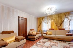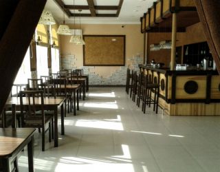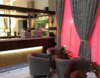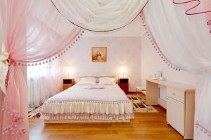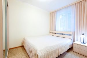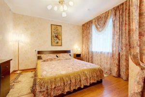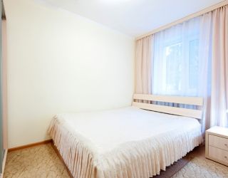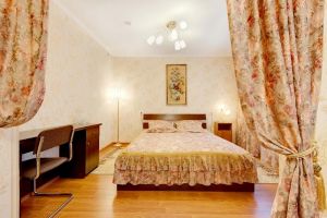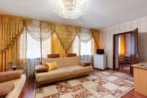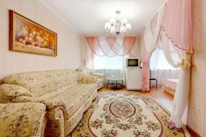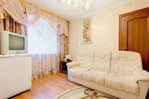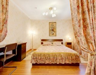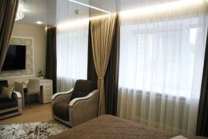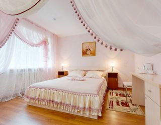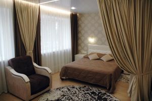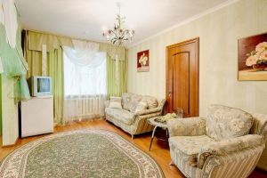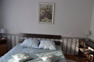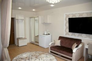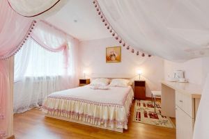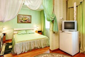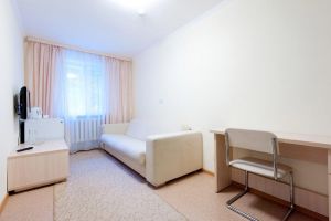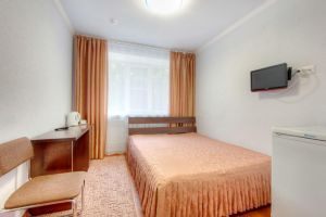 Однокомнатный номер с эркером.Двуспальная кровать (1600*2000), 2 тумбочки, диван, кресла, стол, телевизор, холодильник, чайник, набор посуды, халат, тапочки, полотенце, санузел с душем, набор косметических принадлежностей.