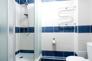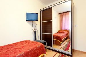 2 кровати односпальные (800*2000), 2 тумбочки, шкаф для одежды, телевизор, холодильник, полотенце; санузел с душем.