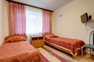 2 кровати односпальные (800*2000), 2 тумбочки, шкаф для одежды, телевизор, холодильник, полотенце; санузел с душем. Секционное размещение.