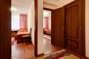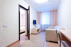В проживание входит посещение бассейна "Бригантина" 1 час в день в удобное для гостей время.Двухкомнатный номер. Двуспальная кровать (1600*2000) , шкаф, 2 тумбочки, стол, диван, кресла, чайник, набор посуды, халат, тапочки, полотенце, санузел с душем, набор косметических принадлежностей.
