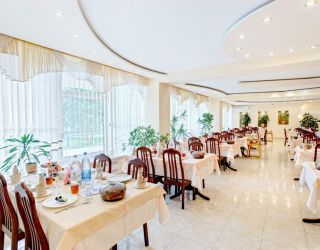 Питание в санатории трехразовое, для детей - четырехразовое, по путевкам "Стандарт" питание организовано по типу "шведский стол" а по путевкам "Интенсив" и "Люкс" - "банкетный зал".