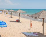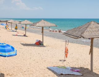 Роскошный бархат песчаного пляжа с блестящей на солнце пуговичной россыпью гальки простирается на 350 метров вдоль морской линии.