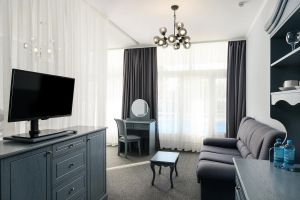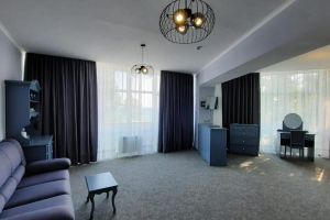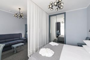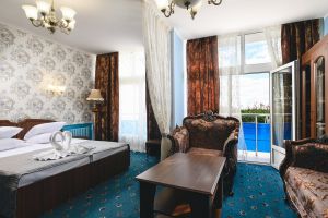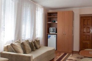 Бытовые принадлежности: таз, ложка для обуви, фумигатор (в летнее время).Джуниор Сюит "Студия" - просторный и светлый номер в современном стиле. Комната визуально разделена на спальную и гостиную зоны при помощи лёгкой шторы. Из балкона каждого номера открывается отличный вид на море. Расширенная комплектация номера (бытовая техника, посуда, предметы гигиены) позволит полностью отдаться отдыху и не думать о мелочах.