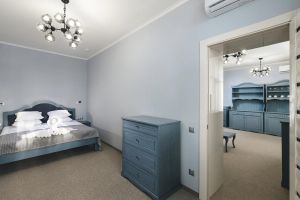 Мебель: кровать, стул, зеркало, прикроватная тумба, встроенный или трёхстворчатый шкаф, туалетный столик.