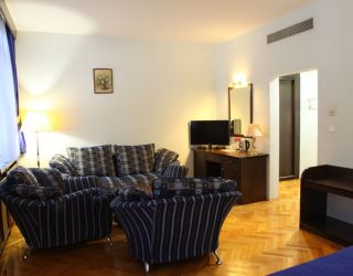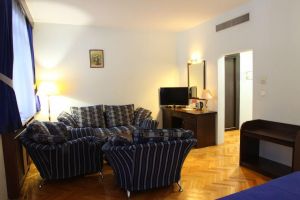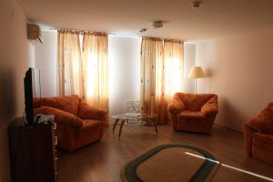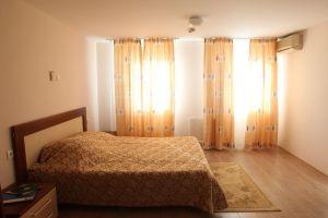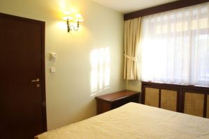Номер оборудован: Большой кроватью или двумя кроватями, спутниковым телевидением, кондиционером, холодильником, душем.