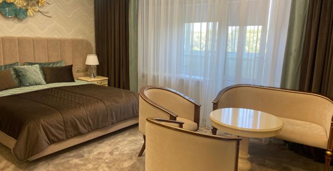 Ремонт в номерах и холлах выполнен в эко – стиле в единой цветовой гамме. Изменен дизайн освещения в номерах высшей категории, мягкий приглушенный свет создает в номерах атмосферу уюта и комфорта.