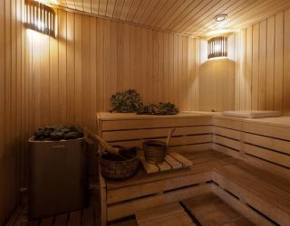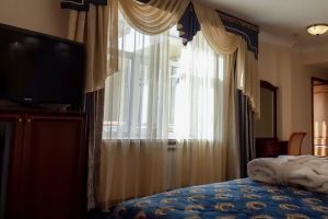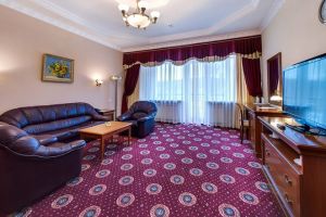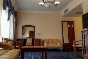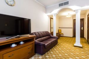 Состоит из двух комнат: одна – это спальня с большой кроватью, вторая – гостиная-кабинет. Номер оборудован двумя ванными комнатами, в каждой из которых душевая кабина и ванна.