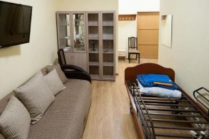 В номере: прихожая с вешалкой для одежды, комната (14-16 м²), кровать, тумбочка, стул, столик журнальный, шкаф для посуды и индивидуальных принадлежностей, телевизор, шкаф для одежды. Холодильник расположен в комнате.