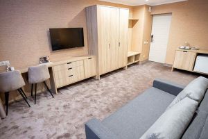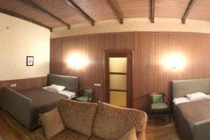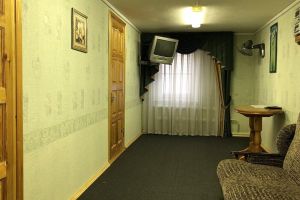 Удобный 2-комнатный номер, состоит из прихожей, спальни, гостиной,санузел с ванной или душевой кабиной. Идеальный вариант для семейного отдыха из 3-4 человек. В номере имеется раскладной двухместный диван. Балкон только в номерах на 2-ом этаже. 2 телевизора. Вид из номера на монастырь, дорогу, лес. Для детей до 3-х лет возможно предоставление детской кроватки.